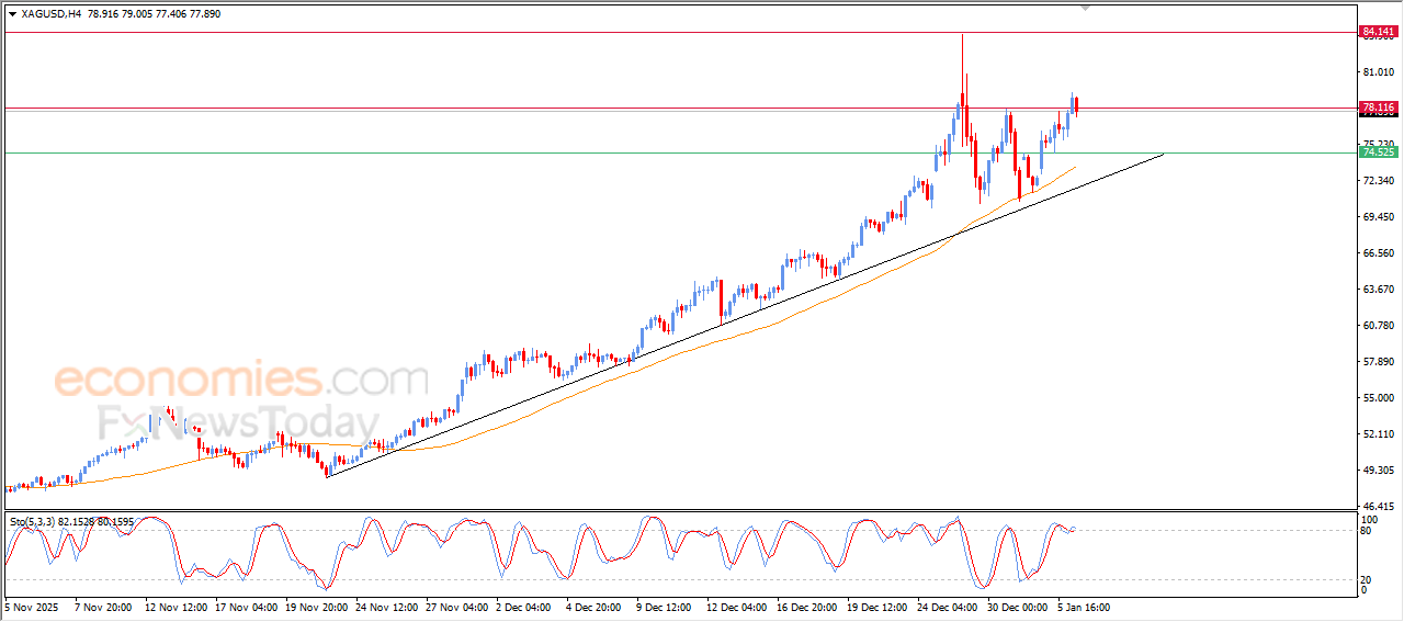 Prisen på (sølv) opplevde små tap i sin siste intradagshandel, på grunn av stabiliteten til nøkkelmotstanden på $78,10, i et forsøk på å få den nødvendige positive momentumet for å bryte motstanden, midt i fortsettelsen av den dynamiske støtten som representeres av handelen over EMA50, under dominansen av den viktigste bullish trenden på kort sikt med handel langs trendlinjen som støtter dette sporet, ledsaget av fremveksten av positive signaler fra de relative styrkeindikatorene, til tross for stabiliteten i overkjøpte nivåer.